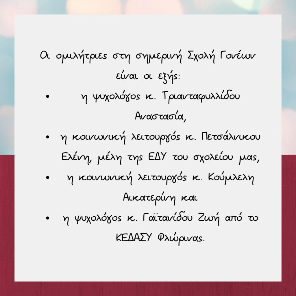 Την Πέμπτη 6/11/2025, στις 11:30 π.μ., στο πλαίσιο της συνεργασίας της Ε.Δ.Υ. του σχολείου με το οικείο ΚΕ.Δ.Α.Σ.Υ. Φλώρινας, πραγματοποιήθηκε διαδικτυακή Σχολή Γονέων μέσω Webex με θέμα: